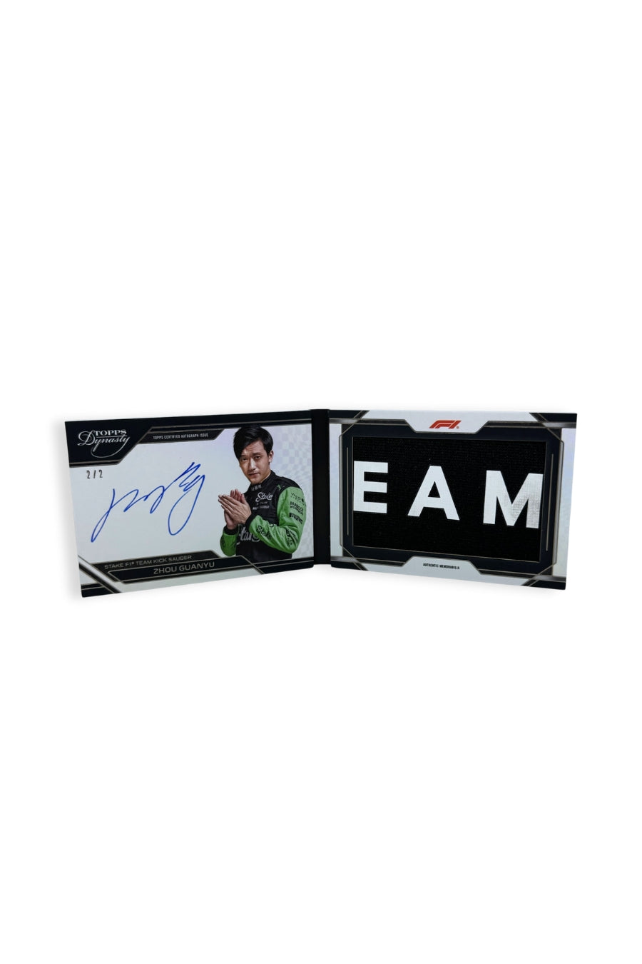 Opening to reveal the bold black-and-white T"EAM" letter patch and a clean on-card signature, this booklet captures the sleek design language of Dynasty at its most eye-catching. Serial numbered 2/2, it’s a scarce and premium collectible that celebrates Zhou’s continued rise with Stake F1 Team Kick Sauber.